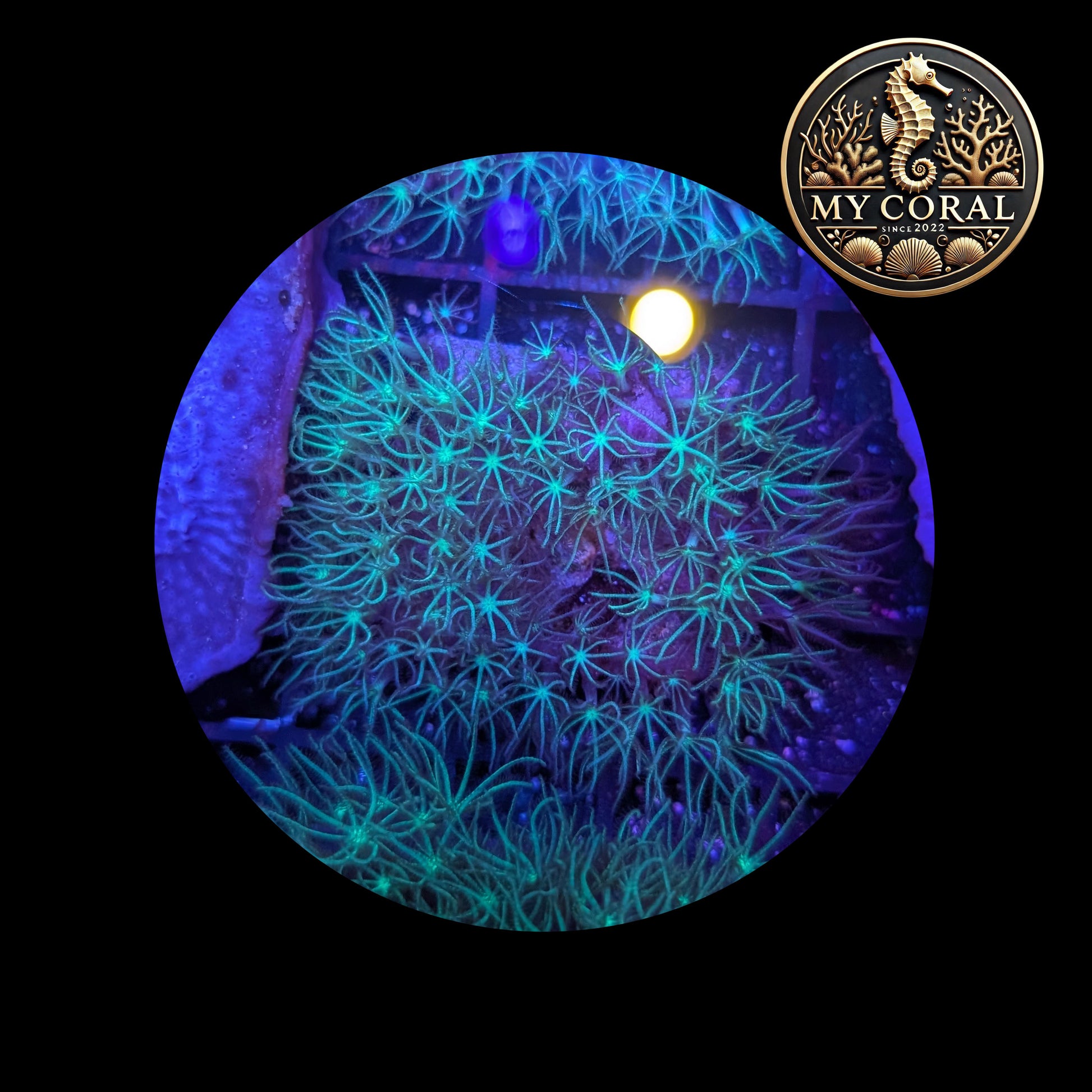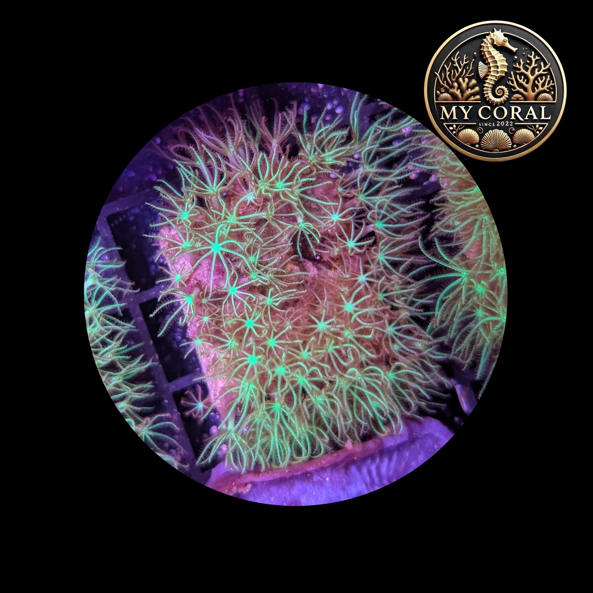 - Polypes verts fluo sur tapis violet ou beige selon souche