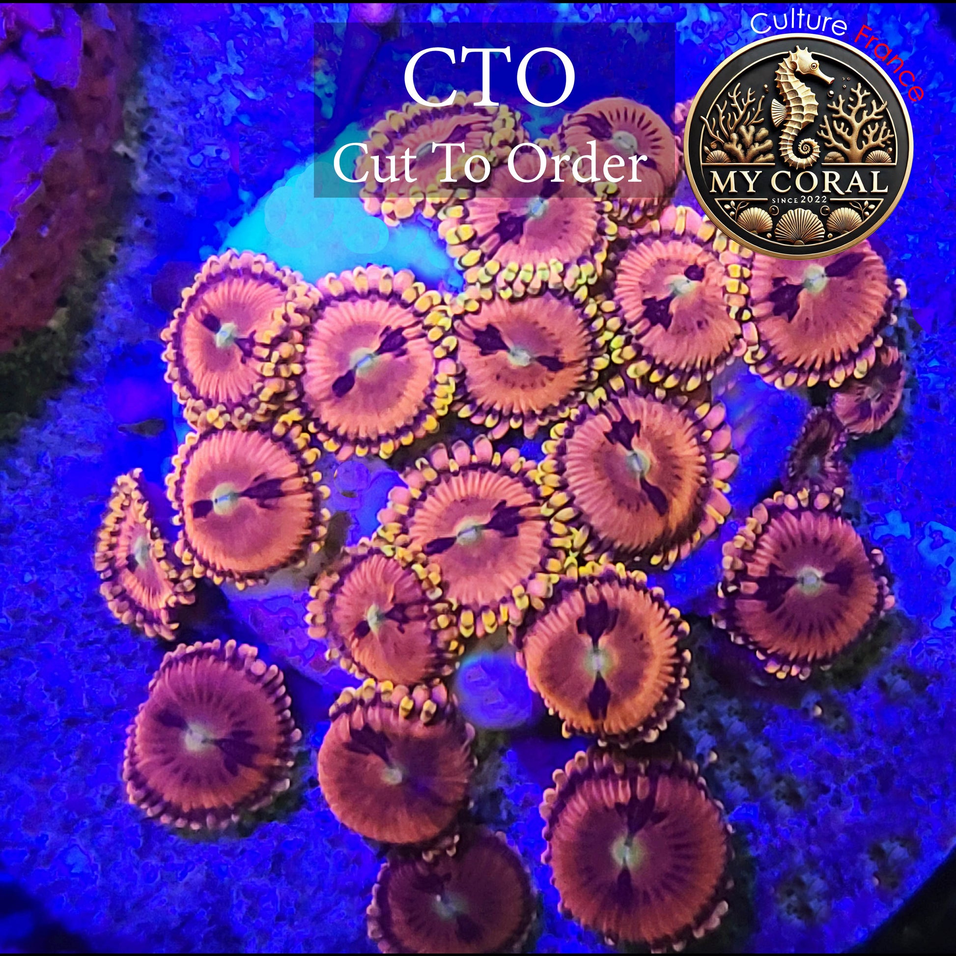 Zoanthus cultivés dans nos locaux en France. Ils sont acclimatés à nos aquariums et habitués à nos rampes LEDS, ce qui augmente la résistances et la vitesse propagations des souches. Leurs morphes sont également plus colorées et développées.